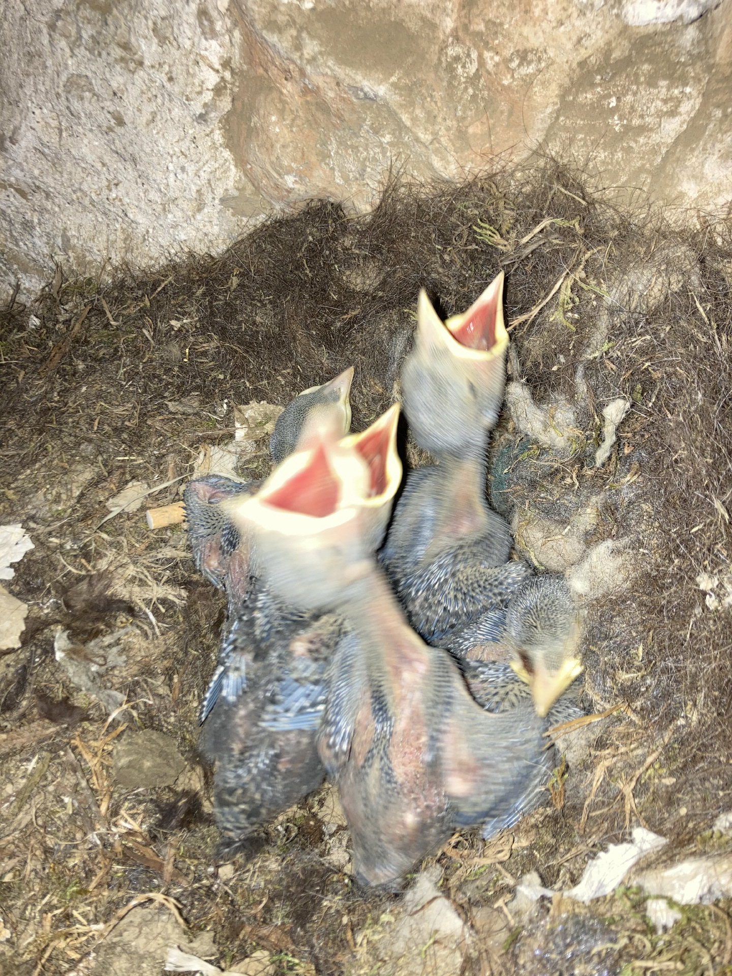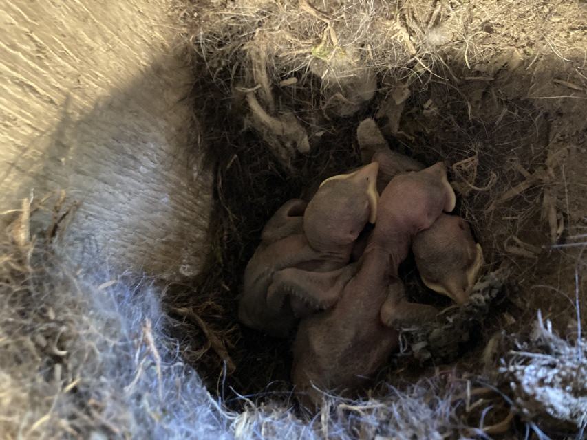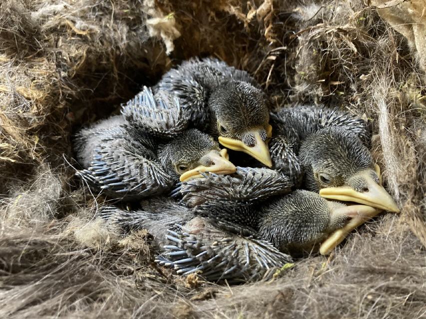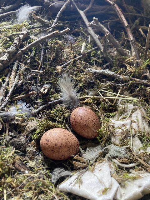 "Es gibt Nachwuchs in unserer Gemeinde! Auf dem Turm der Nikolauskirche befinden sich vier Gelege: Die kleinen Dohlen sind schon geschlüpft, die Falkeneier werden noch bebrütet."