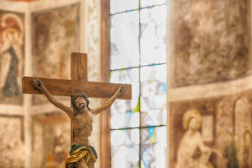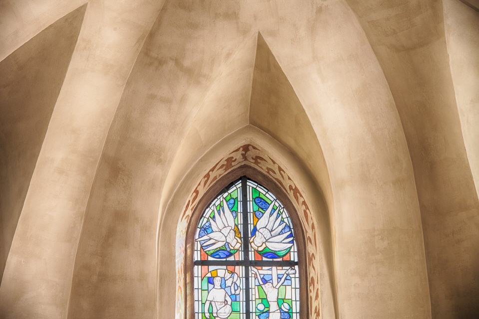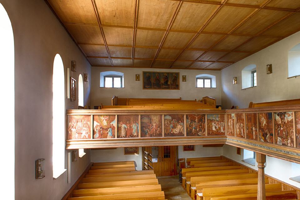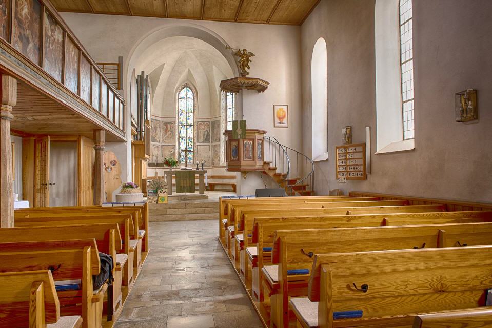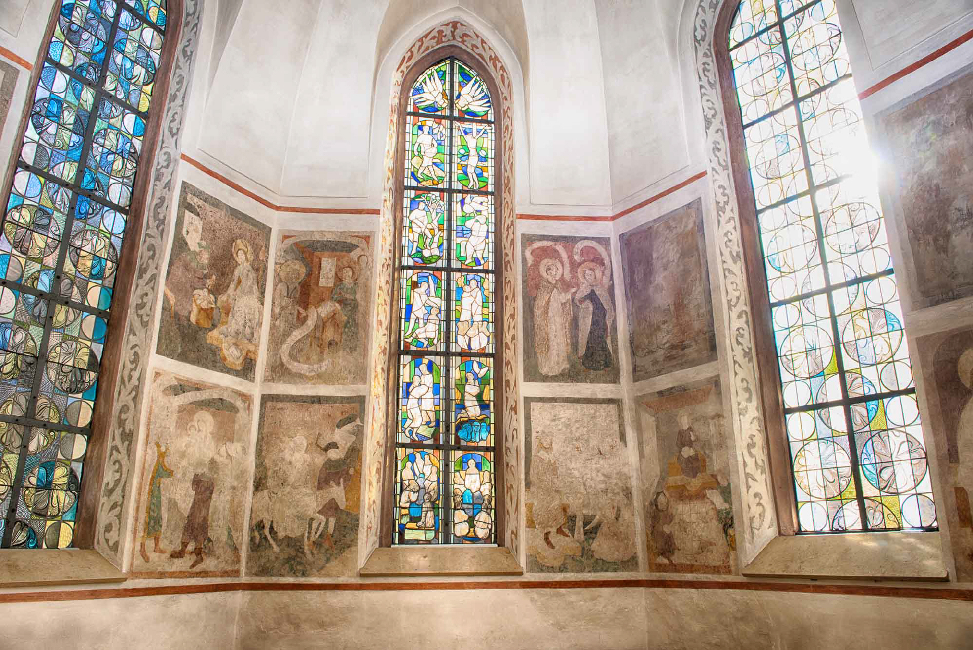Im 15. Jahrhundert wurden Fresken im Chorraum angebracht. In ihrem heutigen fragmentarischen Zustand lassen sich die Inhalte nicht sicher deuten: Sie zeigen in der oberen Bilderreihe vermutlich Heiligendlegenden, in der unteren Kindheitsgeschichten Jesu.